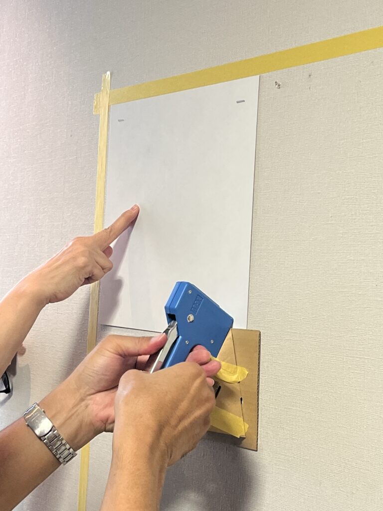 壁面に「ベースシート」(薄い鉄箔入りのシート)をタッカーで固定し、マグネット付きのエコカラットをパチッと貼るだけ!工具はタッカー、マスキング、メジャー、ハンマーなど比較的手に入りやすいものです。
