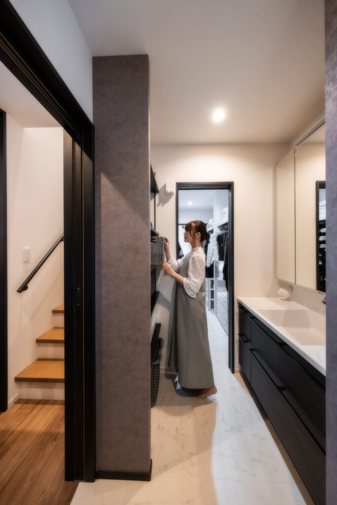 浴室→洗面室→ファミリークローゼットへ一直線。入浴後のバタバタが減り、湯冷めの心配も少なくなります。