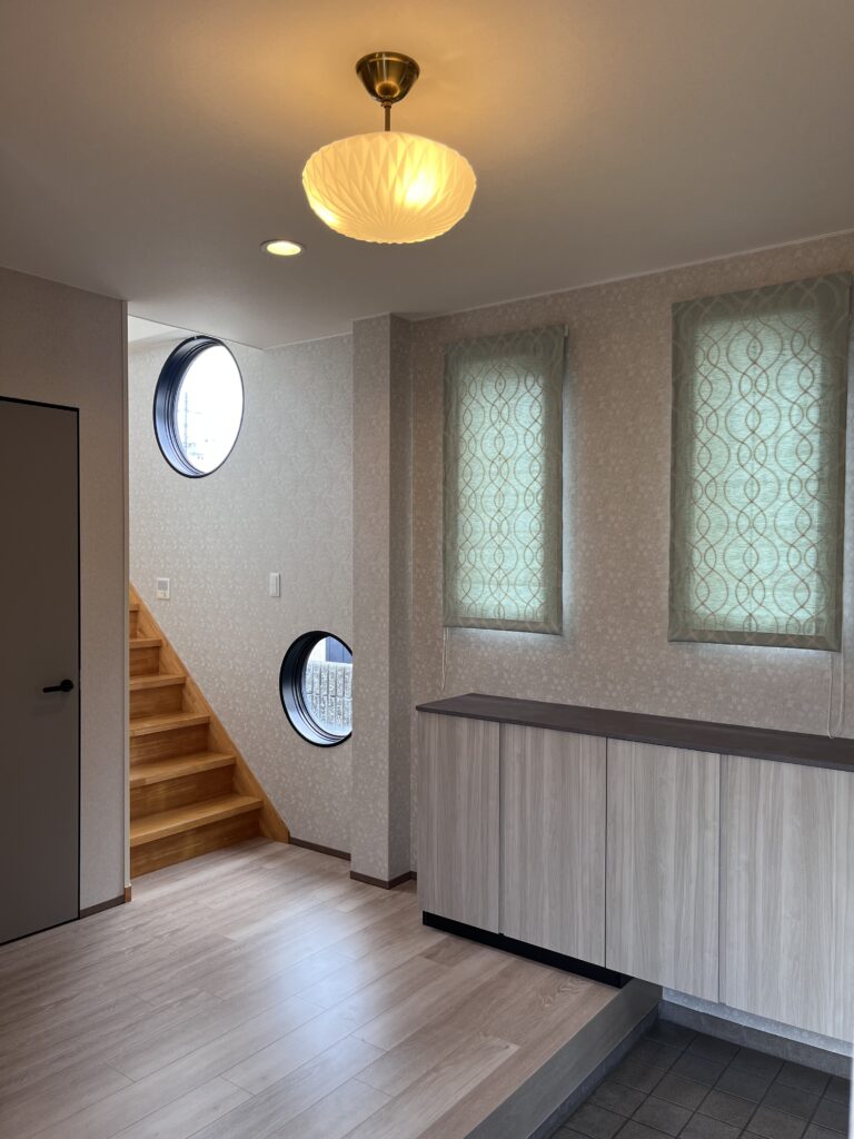 下駄箱や玄関ドア・照明カーテンも変え、コストを抑える為既存の床の上にリフォーム用の薄い仕上げ材を貼らせていただくことになりました。