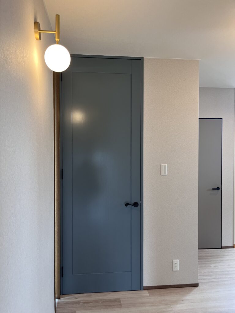 メインのドアは建築当初から造作のハイドアで良いものですので塗装と金物を交換でお色直し。雰囲気も随分変わりました。