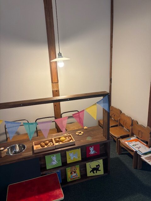 木製のおままごとセット・絵本と子供さんも楽しめるスペースを確保されてい