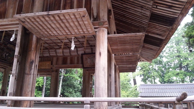 本殿は室町時代初期(1346年)に建立され、現存する最古の大社造で、国宝に指定されています。同じ大社造の『出雲大社』よりは規模こそ小さいですが、宇豆柱(うずばしら)が壁から張りだしている様子が見られます。
