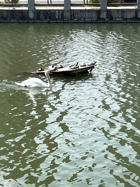 お堀の中の亀も一斉に甲羅干し( *´艸`)白鳥との2ショットも撮れました(^^♪