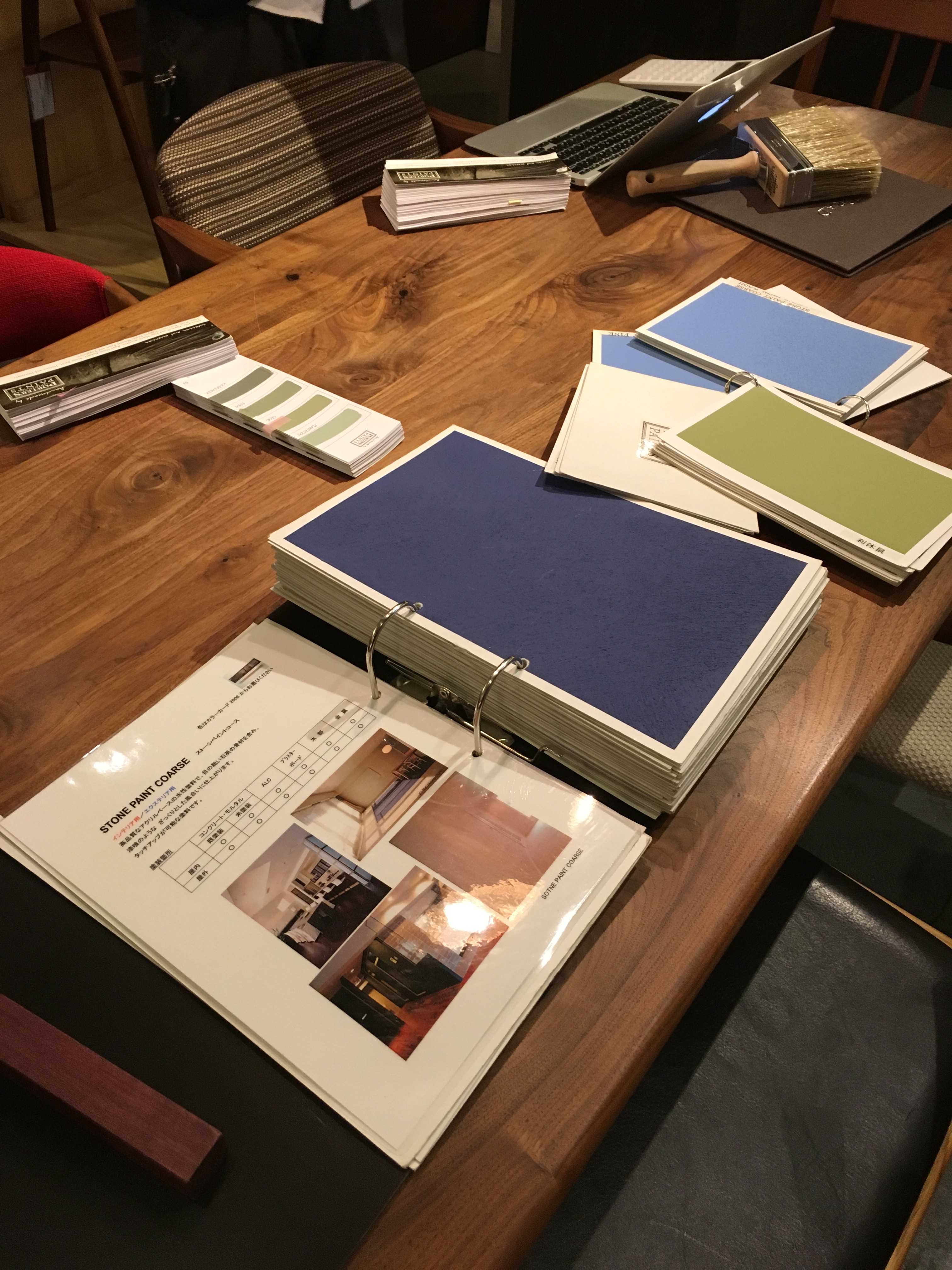 店内の壁はこのペイントで仕上げていますのでお店に行った時は見てみてください!!(^^)