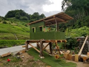 庭に大木が立っているわけではないので、まずは子供らと穴を掘り、去年崩れた裏山の丸太を土台柱として立てスタートです。