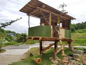 アレンジで、丸太の梯子と、丸太の輪切りのステップ、そして外壁は人工芝でグリーンを強調✨