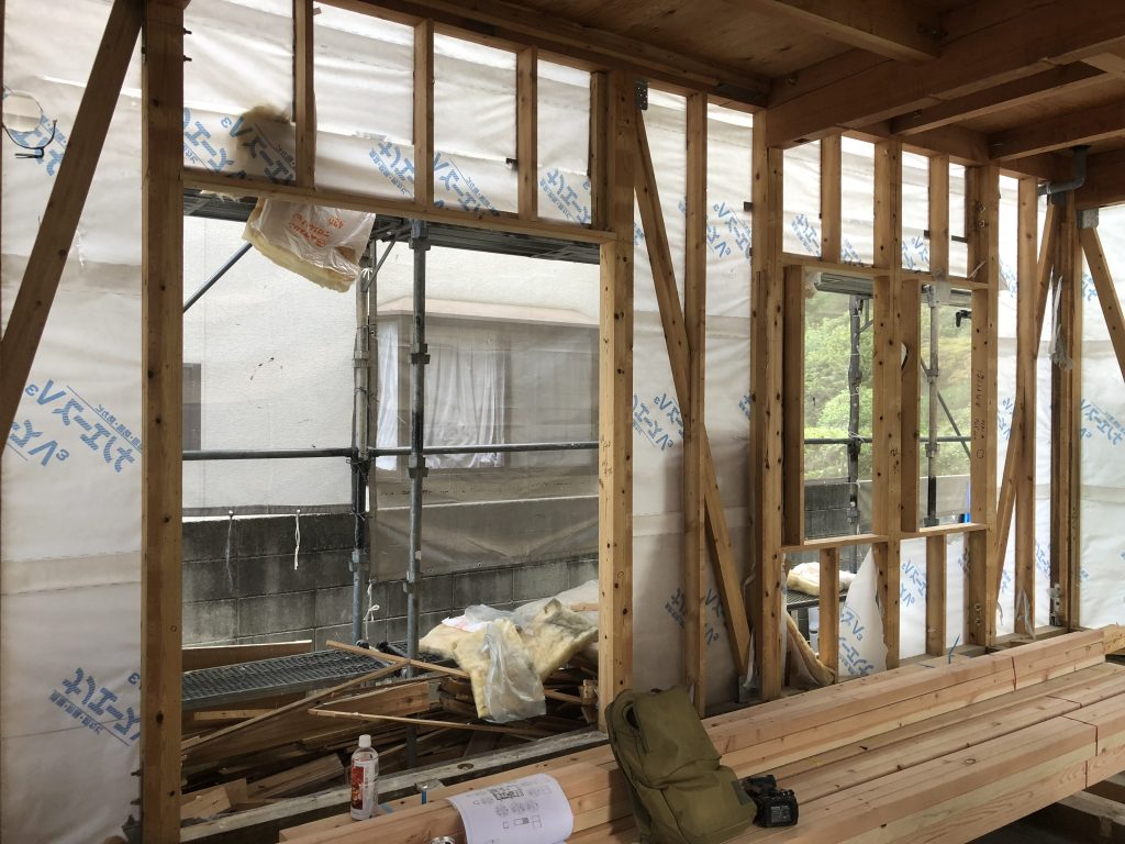 現在、改装現場を担当しており、壁や断熱材を撤去したので、ほぼほぼ柱のみのスケルトン状態なっている現場があり、