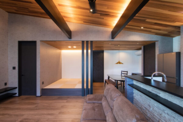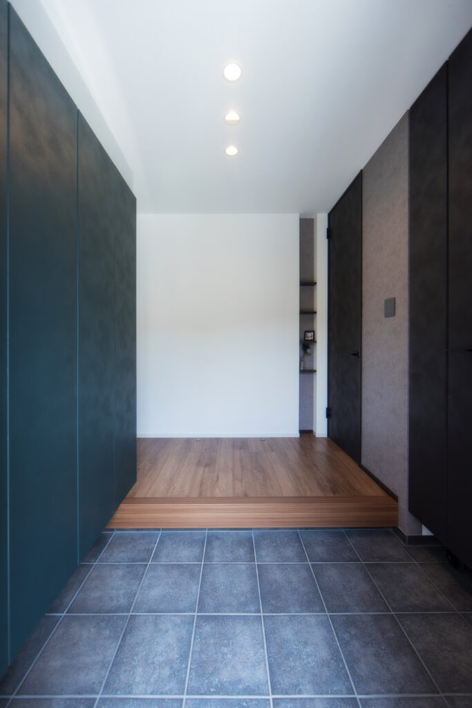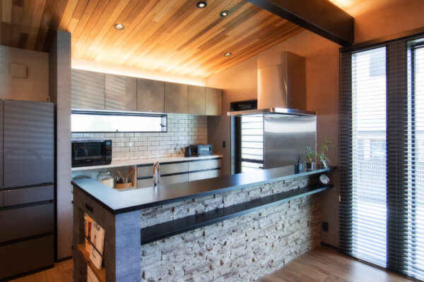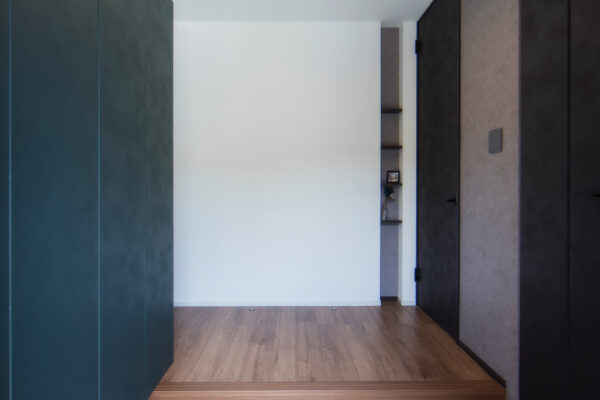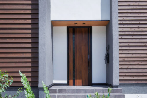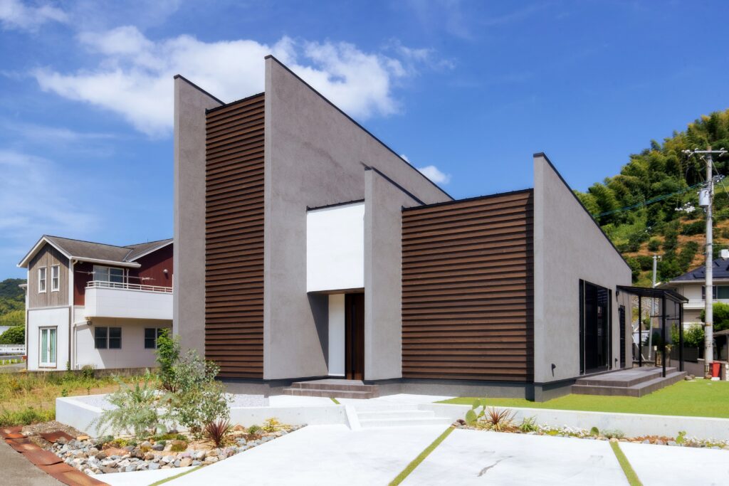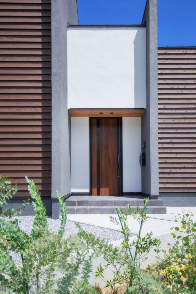 色や質感を使い分けた塗り壁と板の鎧張りで構成された、スタイリッシュなファサード。住宅らしい要素をそぎ落とし、垂直ラインを際立たせることで、商業施設のような雰囲気をまとっています。