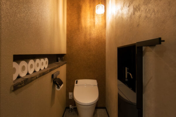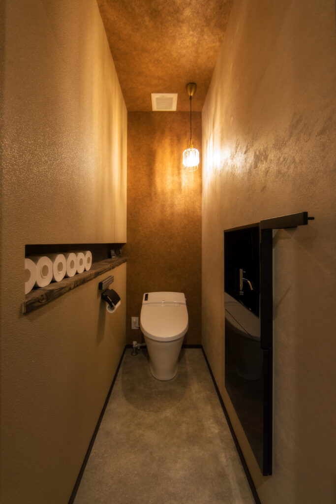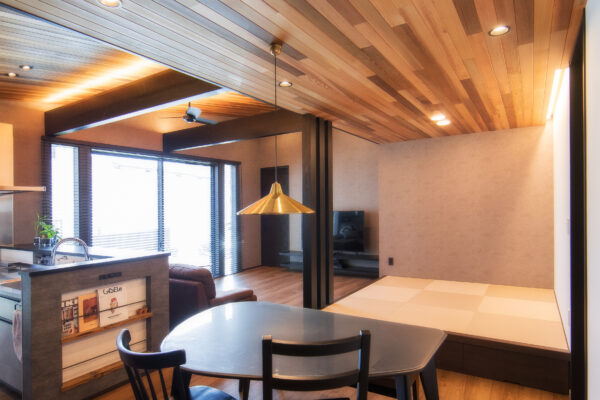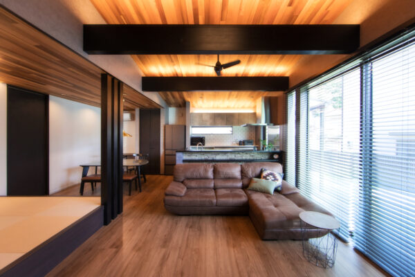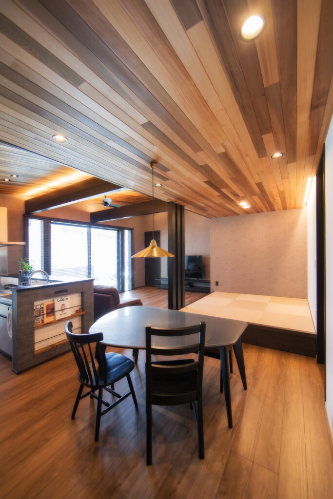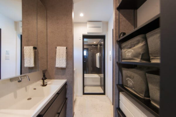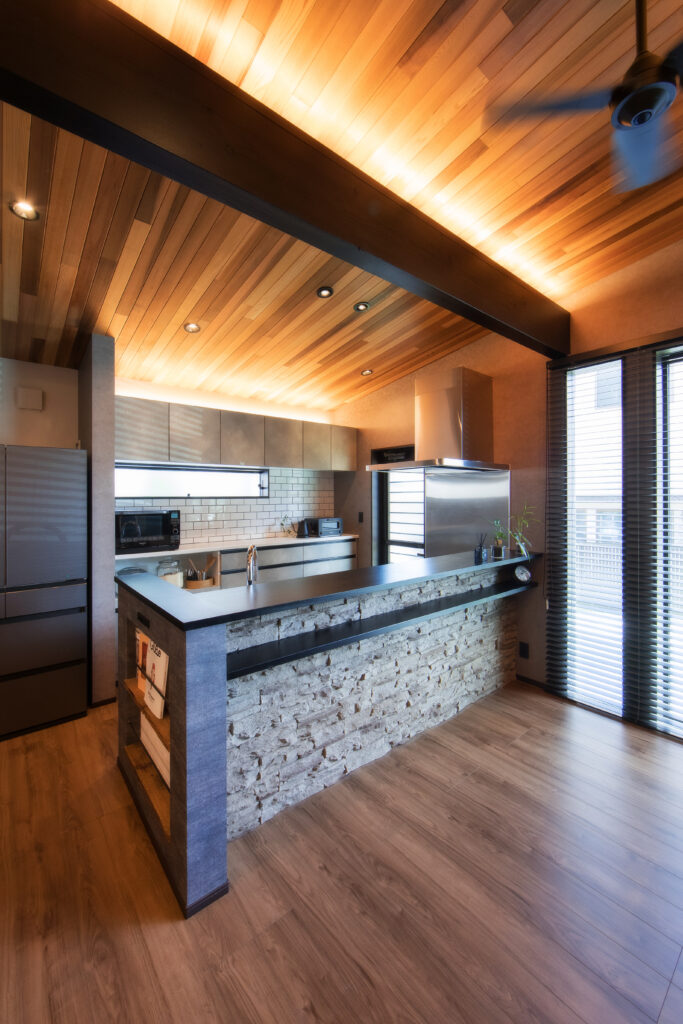 色や質感を使い分けた塗り壁と板の鎧張りで構成された、スタイリッシュなファサード。住宅らしい要素をそぎ落とし、垂直ラインを際立たせることで、商業施設のような雰囲気をまとっています。