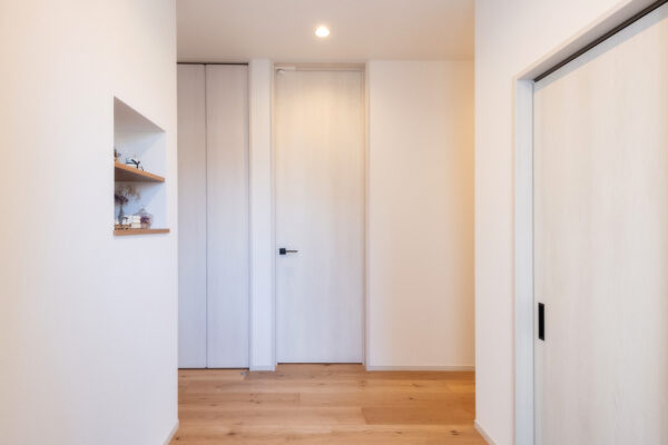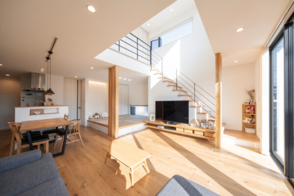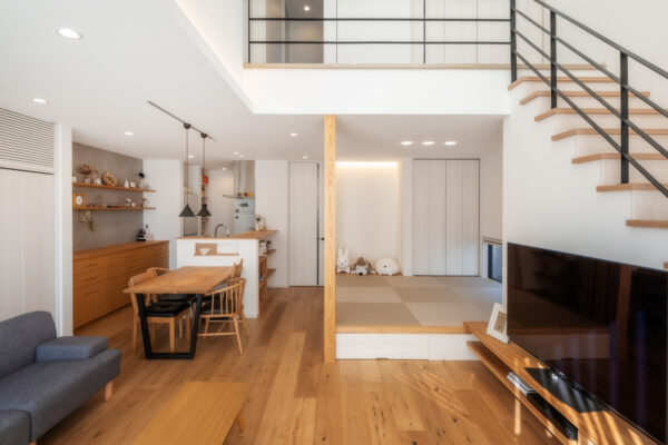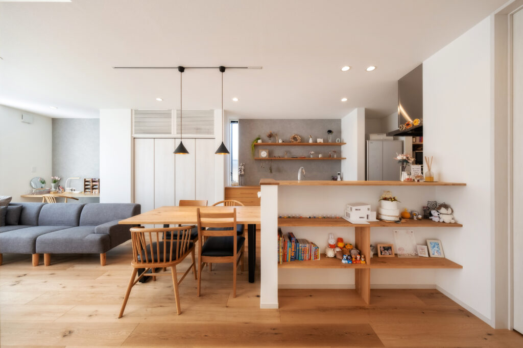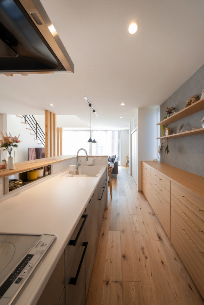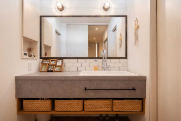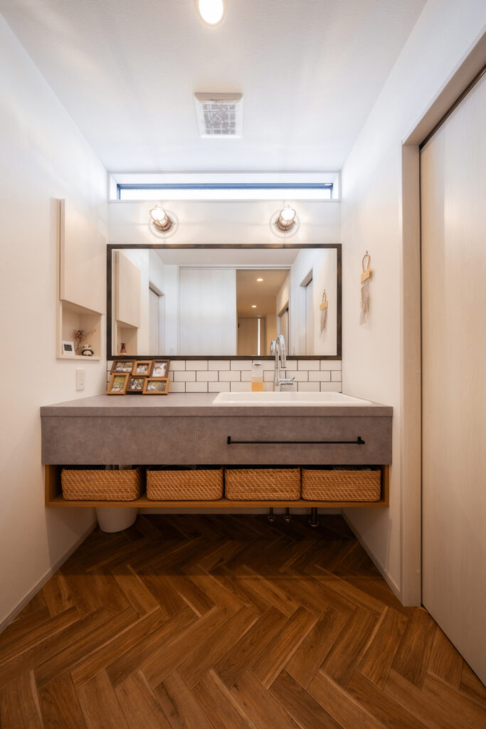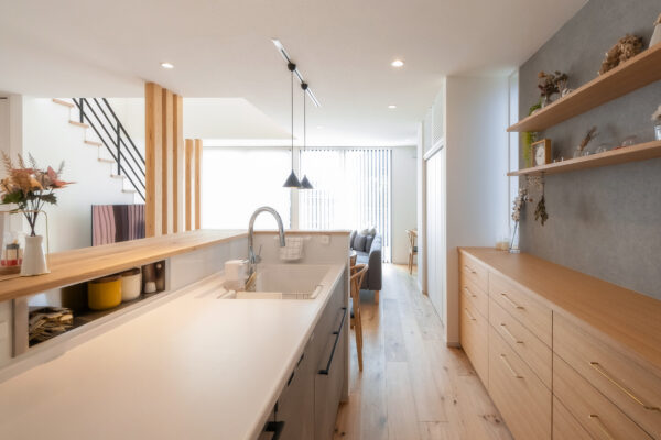 外部からの視線や生活感をさりげなく整えながら、家事が自然とスムーズにつながる動線を計画。造作洗面台や回遊できる水回り、成長に寄り添う収納や小上がり和室など、家族それぞれの時間を心地よく支える工夫を随所に施しました。視線の先に余白が生まれ、暮らしにゆとりが広がる住まいです。