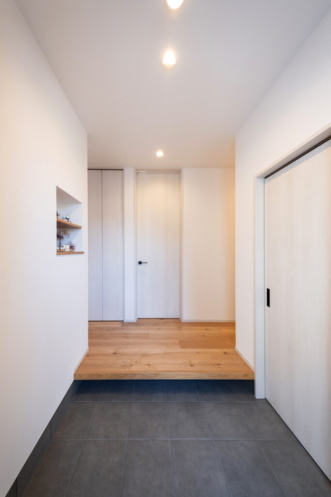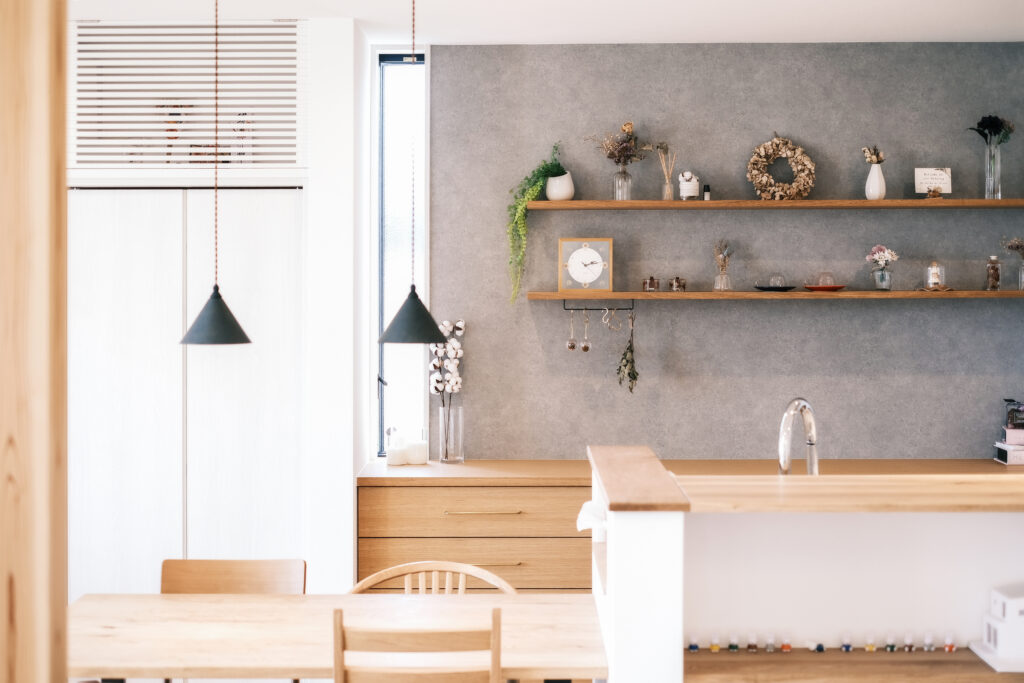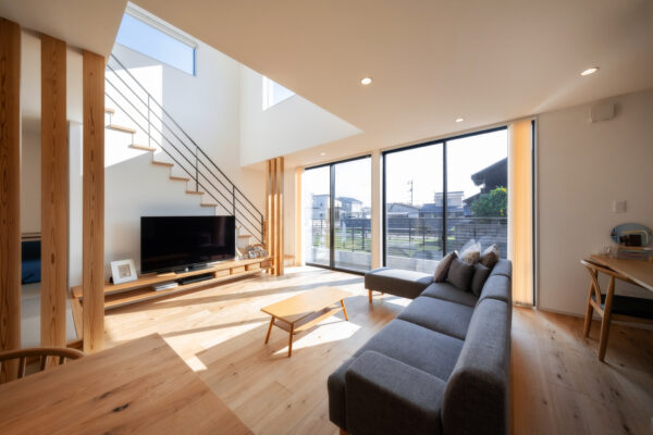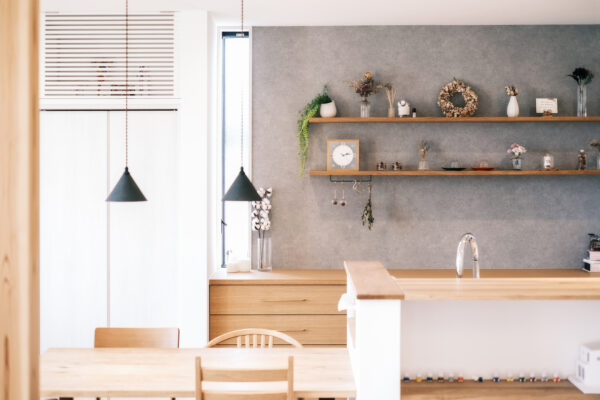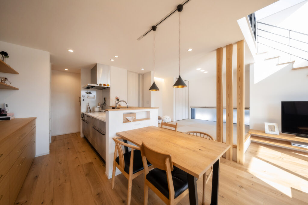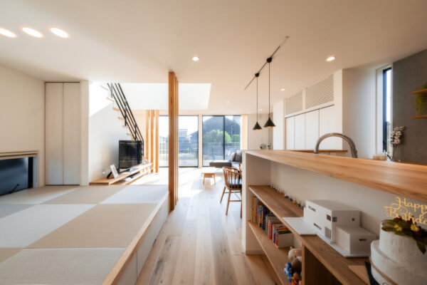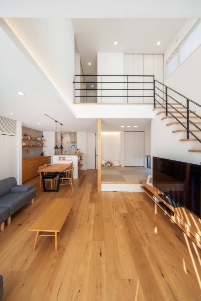 外部からの視線や生活感をさりげなく整えながら、家事が自然とスムーズにつながる動線を計画。造作洗面台や回遊できる水回り、成長に寄り添う収納や小上がり和室など、家族それぞれの時間を心地よく支える工夫を随所に施しました。視線の先に余白が生まれ、暮らしにゆとりが広がる住まいです。