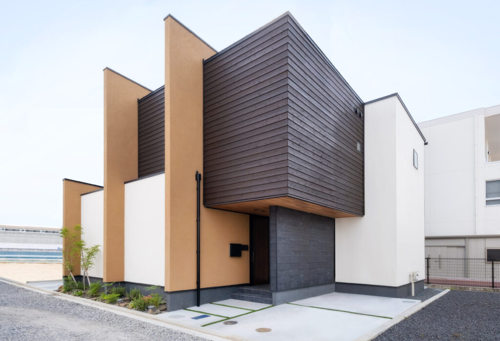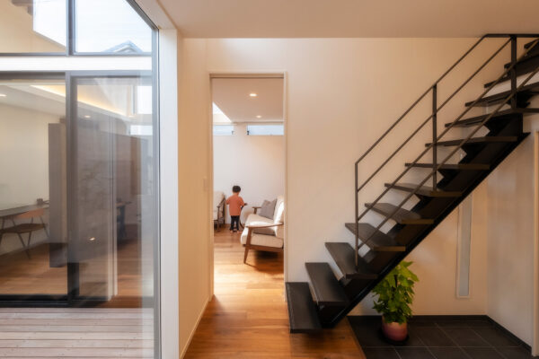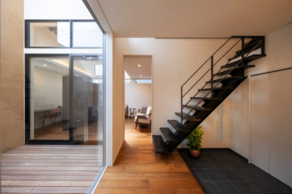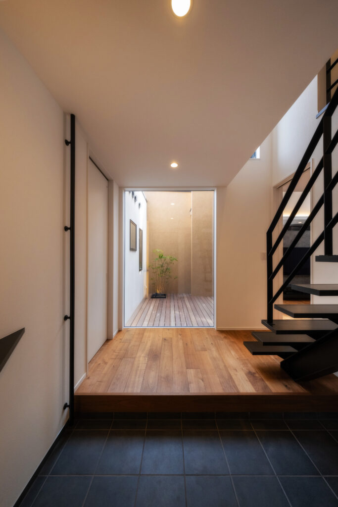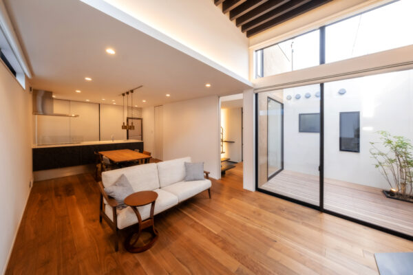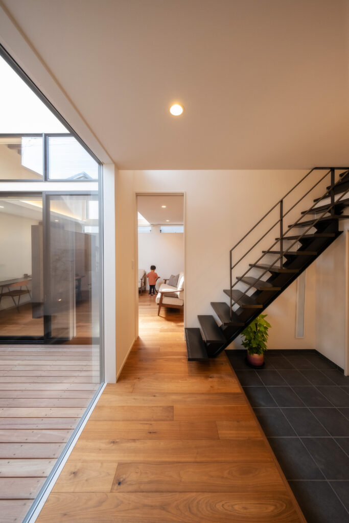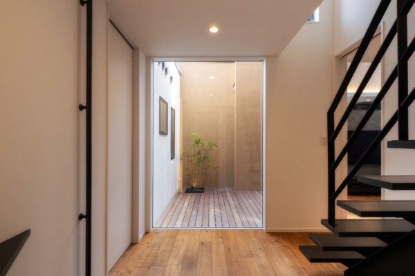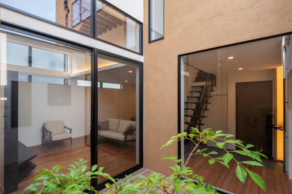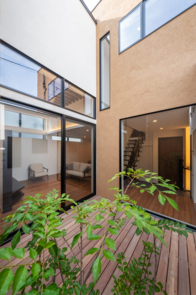 ひときわ目を惹くモダンな外観。外部からの視線を抑えつつ、邸内では中心に据えた中庭から、家じゅうにやわらかな光が差し込みます。